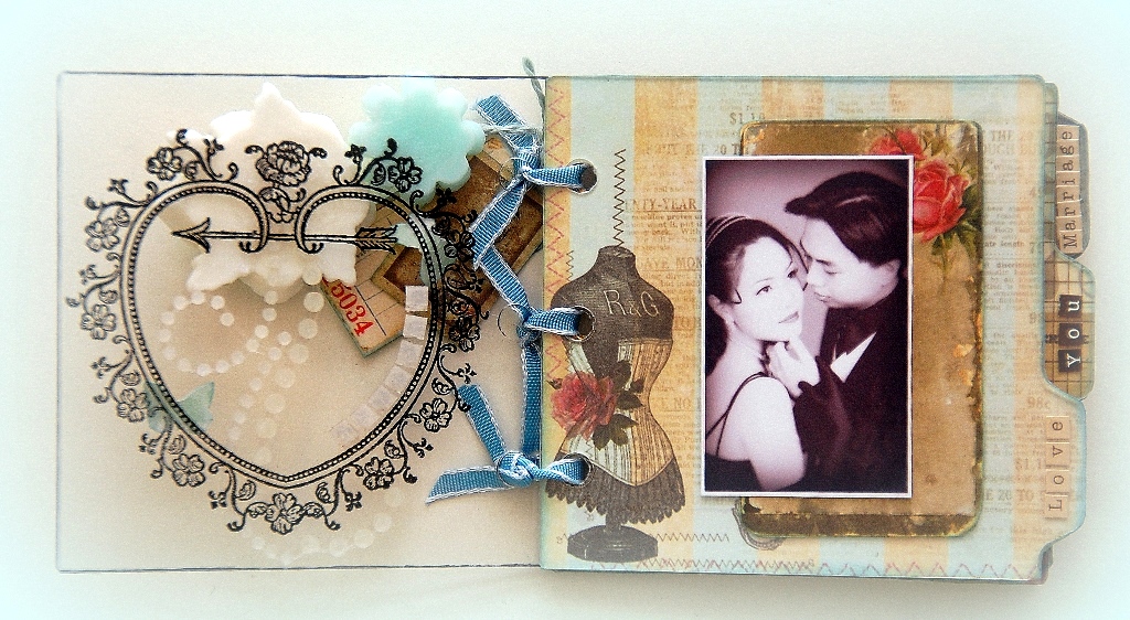 This is a fast and easy album. To decorate it, I've simply used some pattern papers to layer and detailed each page. For the cover, I've used a heart overlay and add some resin flowers and pearl flourishes.