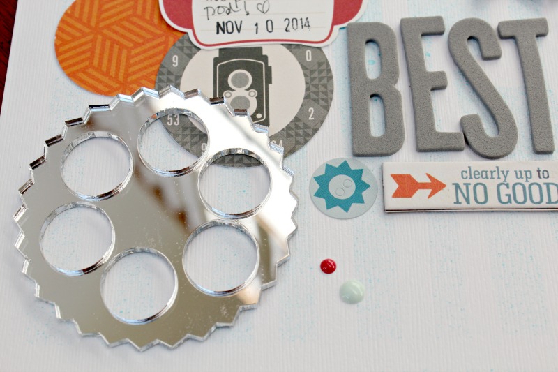 Using ephemera and hand punched circles, I layered the gears above and below my photo! I thought they went perfect with the circle theme!