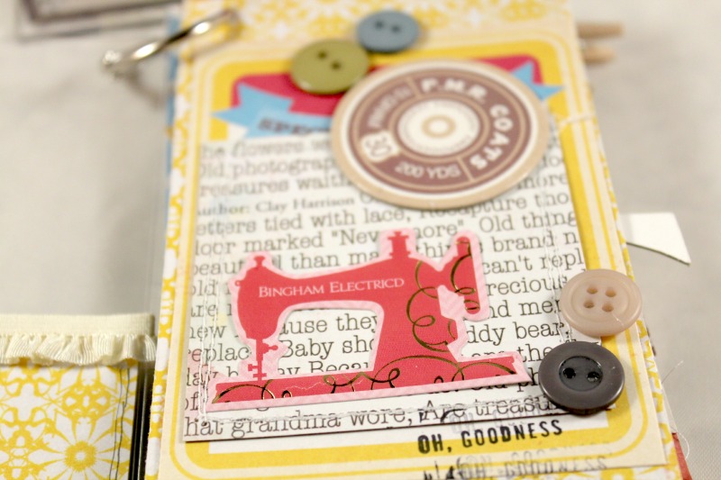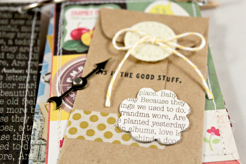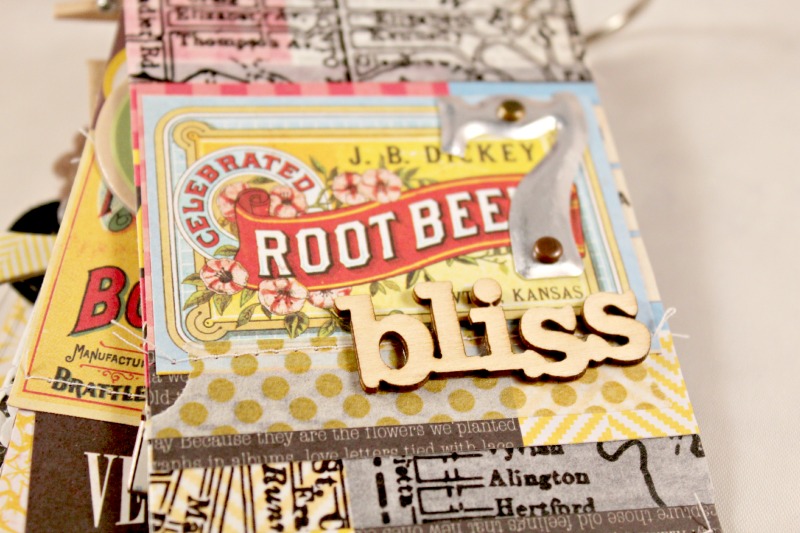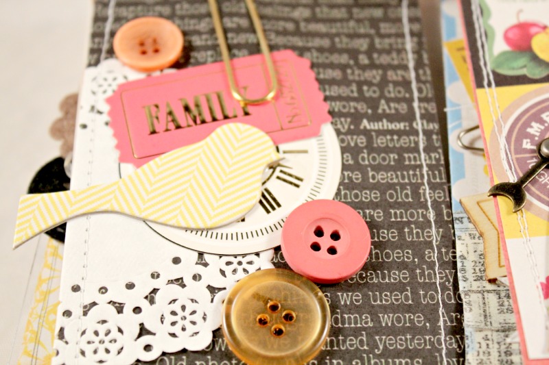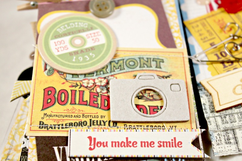 Additional embellishments: wood veneer shapes: Studio Calico, Maya Road; decorative pins: Maya Road, Jillibean Soup; washi tape: Freckled Fawn, Queen and Co; metal embellishments: Maya Road, Tim Holtz; felt flowers: Hero Arts; chipboard camera, ribbon: Maya Road; adhesive: Beacon, Tombow, 3m; Bakers twine: Whisker Graphics; enamel dots, rhinestone: Teresa Collins Designs; stamps: American Crafts, Teresa Collins Designs; misc: buttons, thread, paper clip, doily
