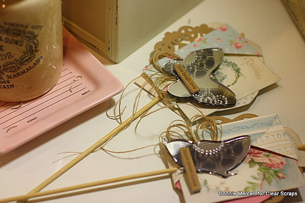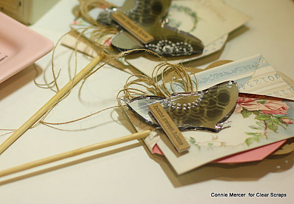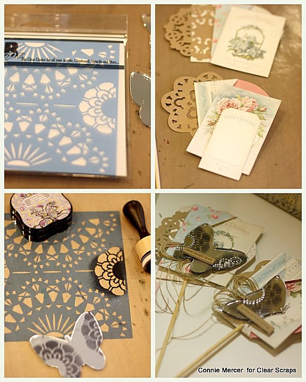 Hi, Connie here with "cards on a stick". Great for a potted plant or a candy jar. Just stick them in what you want to use as a gift. I used the Butterflies Mirror Embellishments and the 6" Doily Stencil by Clear Scraps. Here's what I came up with and how I made them~