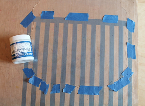 1. Tape the 12 x 12 Stripe Mascil to the XL Deco Shape and your craft mat. I like to make sure to tape it down on each of the stripes all along the acrylic piece to be sure the lines don't shift while applying the embossing paste.