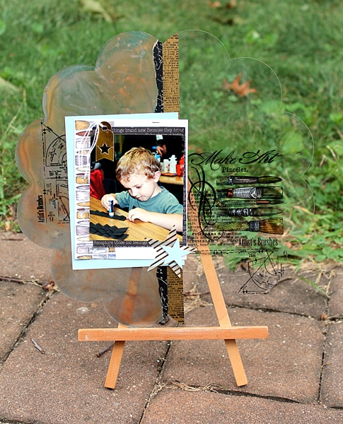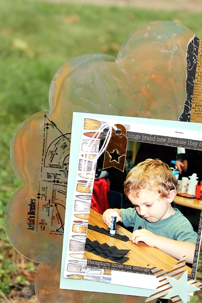 For today’s layout, I wanted to find a way to add a bit of shimmer and color to the acrylic while keeping the transparent quality. The solution…Beacon’s Fast Finish and mica powders! Fast Finish is a decoupage medium for adhering paper and fabric to wood but it also works fantastic as a fixative for mica powders because it is so fluid.