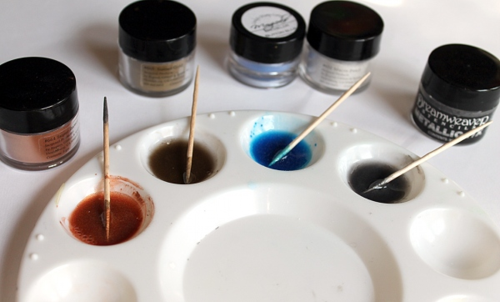 I began by pouring out some Fast Finish. Next I added a bit of mica powders from the containers and mixed them into the Fast Finish. You only need a tiny bit of mica powder. I added a piece of washi tape down the XL Dazed shape to keep the Fast Finish mica mixture from spreading. I dabbed the Fast Finish mica mix onto the acrylic shape with a paintbrush. To keep the mixture from seeping under the acrylic shape, I lifted the entire piece up onto acrylic blocks.