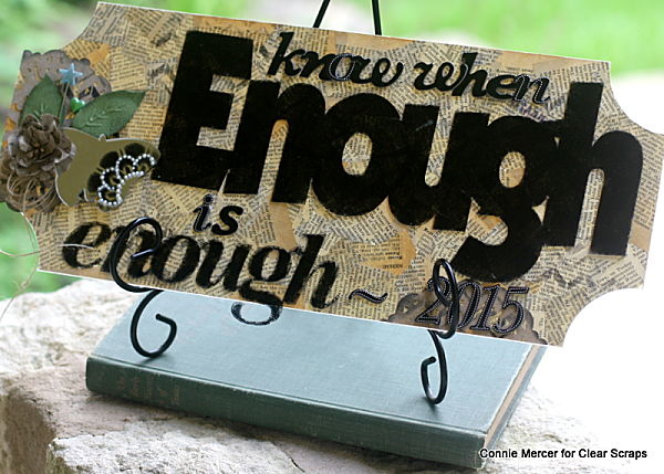 Hi, Connie here to share with you OLW (one little word) for 2015, using an acrylic word cutout by Clear Scraps. My word is ENOUGH. I never seem to know when a enough is really enough. I'm especially talking about my creative work. I want to do it all. I do art, be creative, everyday during the week. It is my day job. I treat it like a job~I love it!!! But sometimes ENOUGH already, I need that happy medium:)