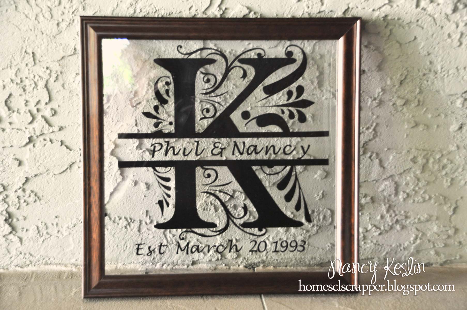 Hi everyone! Nancy here today to share with you another project I made using Clear Scraps, my electronic cutter and some vinyl. I have seen so many of these split letter monogram frames and people who have cut themselves trying to create them. Clear Scraps to the rescue.