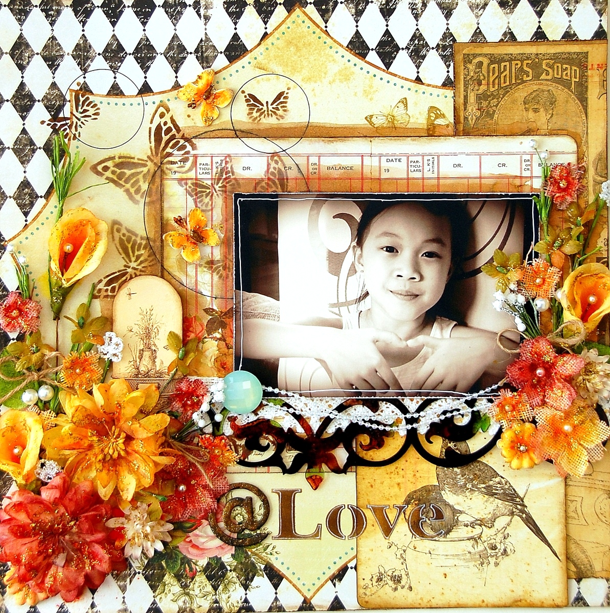 To create this layout, I've used an acrylic ornate border and some mascils by Clear Scraps.