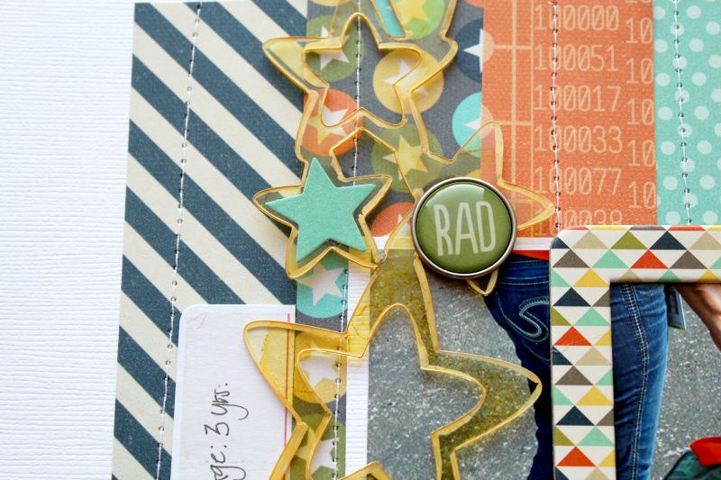Additional products used: patterned paper, brads, enamel dots, die cuts, chipboard: Simple Stories; cardstock: Bazzill; chipboard letters and date stamp: American Crafts; inks: Ranger; misc: sewing machine, thread.