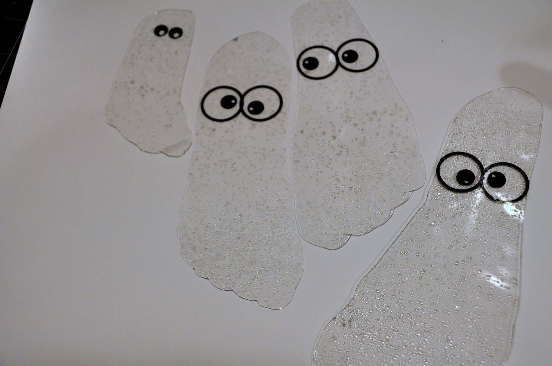 From there, it was simply a matter of embellishing the "ghosts". Some eyes cut with my Cricut from vinyl and some irRESISTible spray to give them some extra depth.