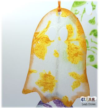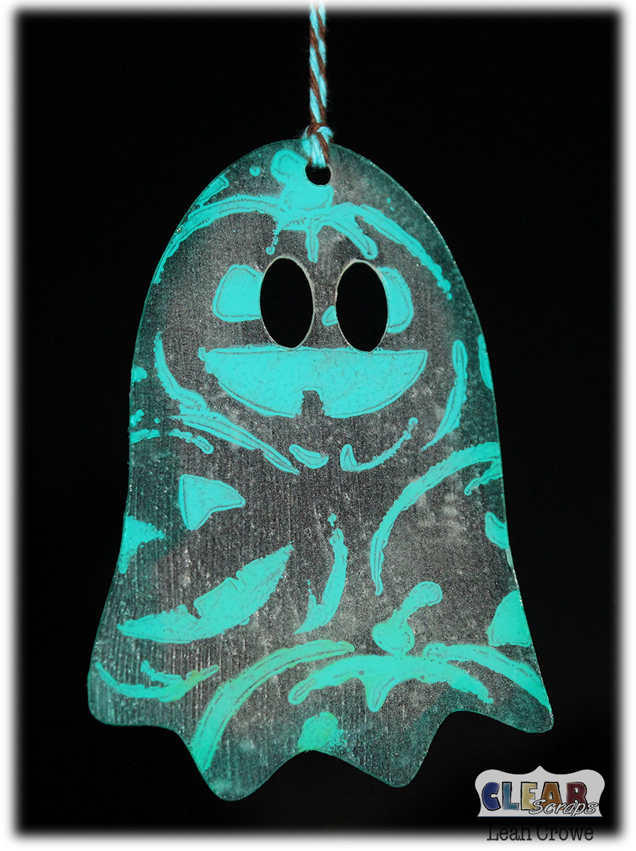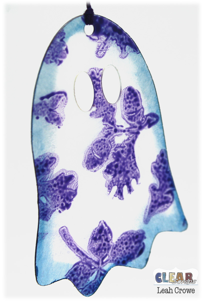 Once both of those coats of paint dried, I removed the film from the back of the ghosts and distressed the edges using Stazon Inks.