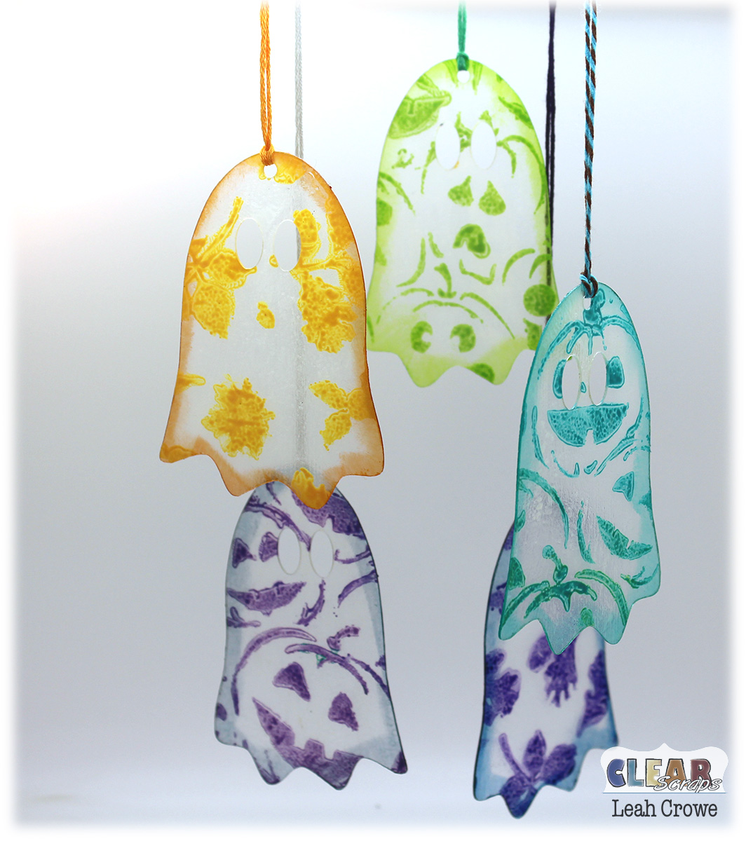 I took these Mini Ghosts off the key ring, and used the 6×6 mascils pumpkin faces and fall leaves to stencil the designs using acrylic paint onto the ghosts.