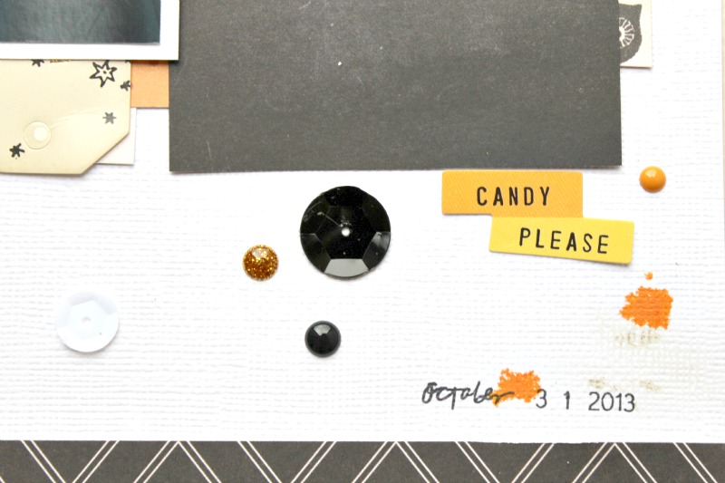 Additional products used: patterned paper, stickers, wooden veneer, enamel dots: Crate Paper; sequins: Teresa Collins Designs; stamp: American Crafts; ink: Ranger, cardstock: Bazzill; vellum: Webster Pages; adhesive: Tombow, Beacon; misc: paper clip