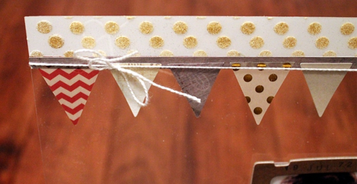 Using Washi Dot Mascil on the front of the layout in the border painted white, spread White Embossing Paste. Immediately sprinkle with gold micro glitter.
