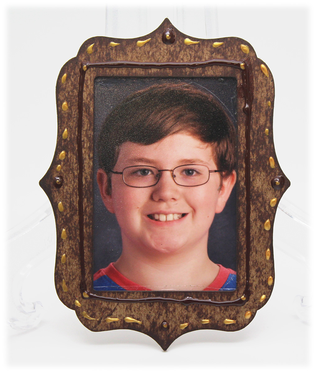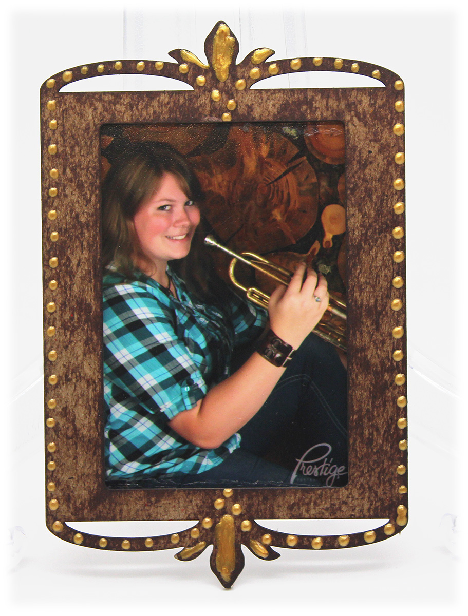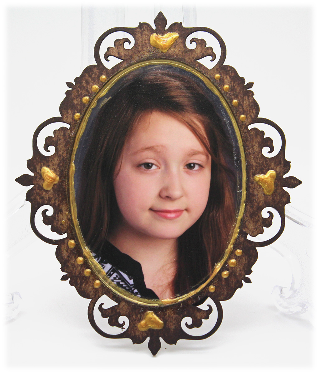 Once I decorated the frames with Ink and Perfect Pearls, I adhered wallet size photos to the
