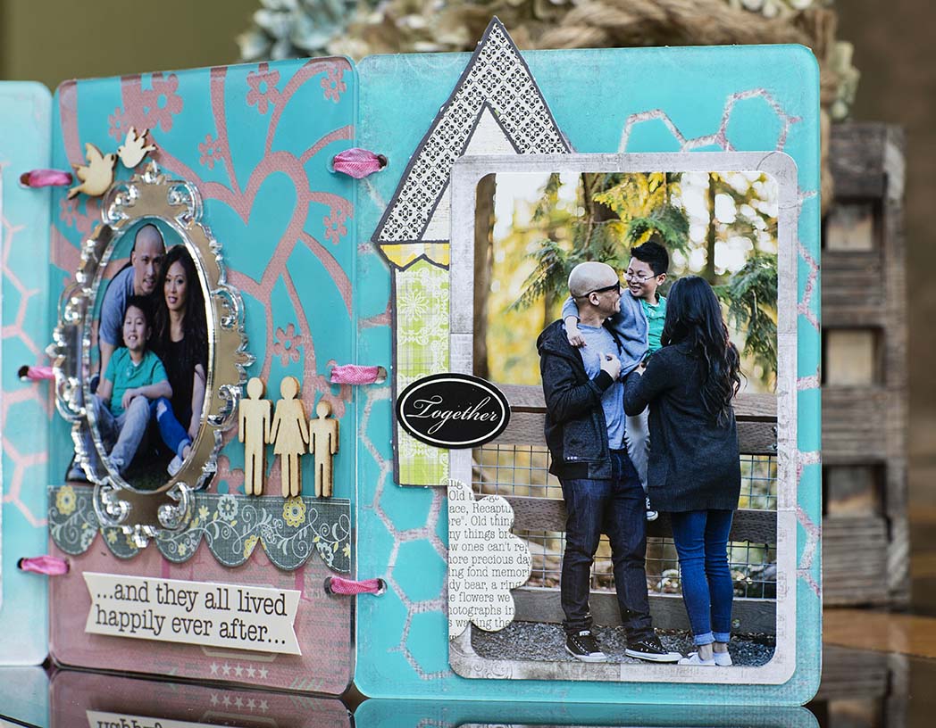 I used the 6'"chicken wire mascil and spray paint for the background, painted the back side of then I added photos and embellishments on top side of the acrylic.