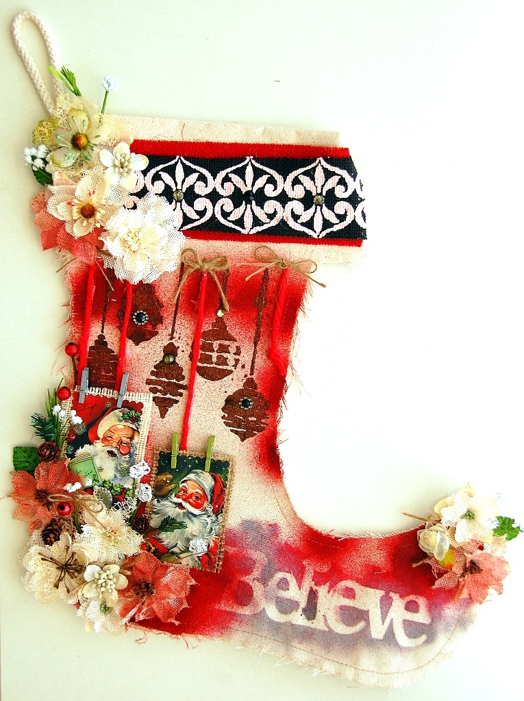 I've used the vintage flourish mask and some white paint to create the details on the top part of the stocking. In the picture above, I've also used the Christmas bulbs mask and some dimensional paint to create some details on this stocking.