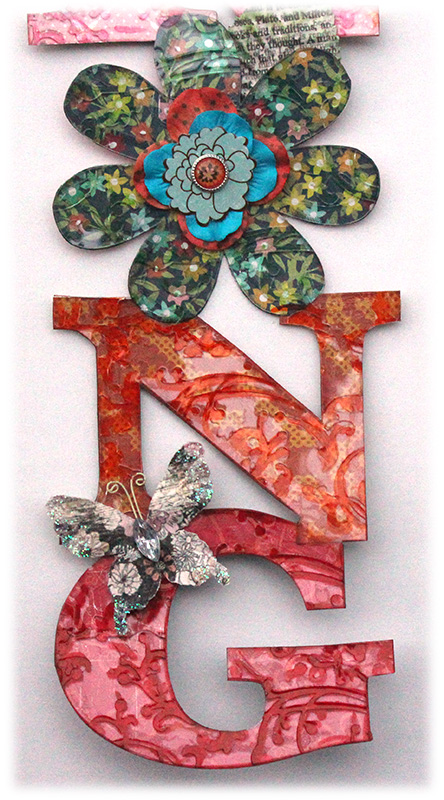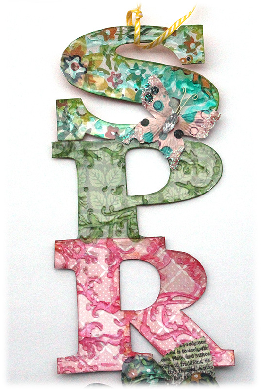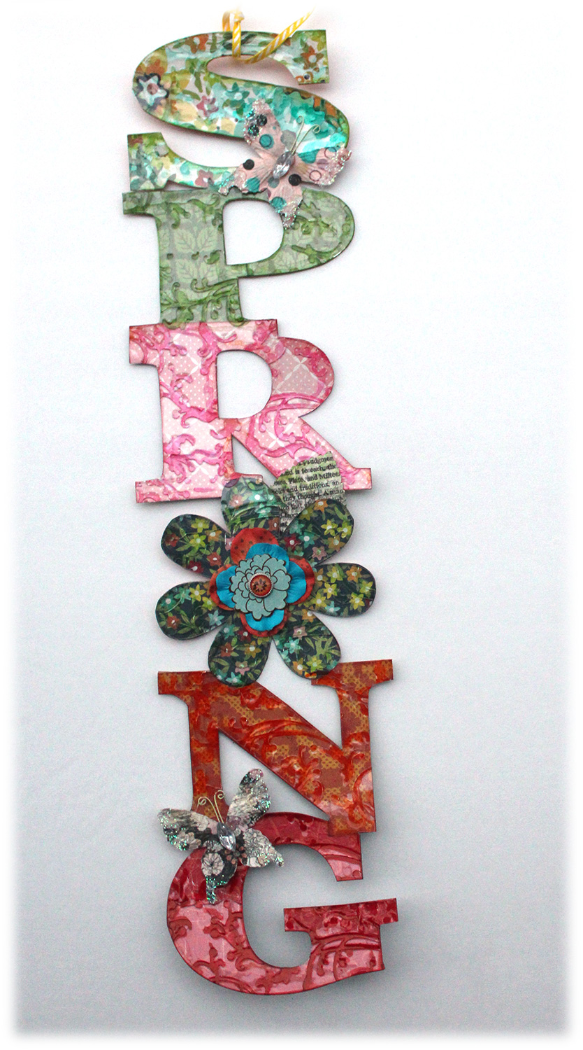 I adhered a few embellishments, and voila, a beautiful spring home decor piece.