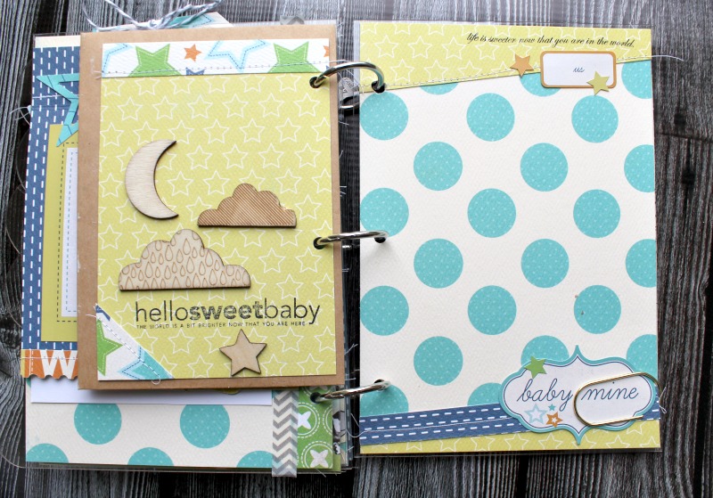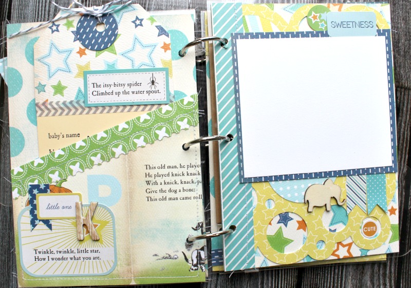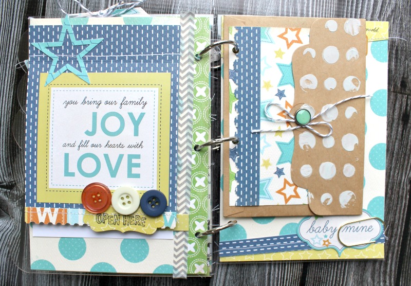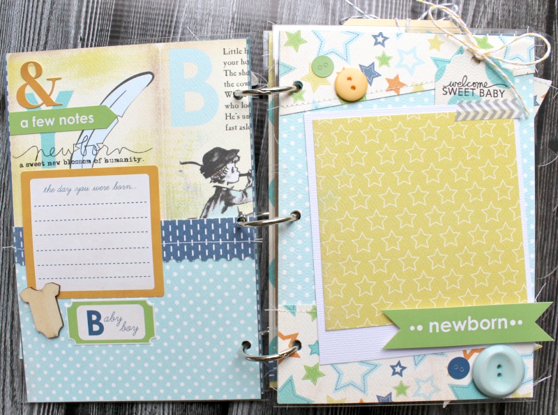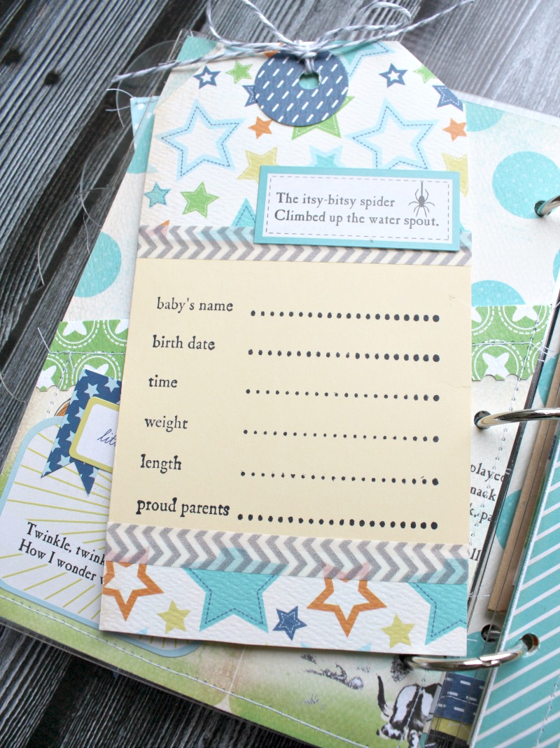 Hiding tags in pockets or behind photos is a great way to add more elements to your books. Here, I used a stamp to add birth date details.
