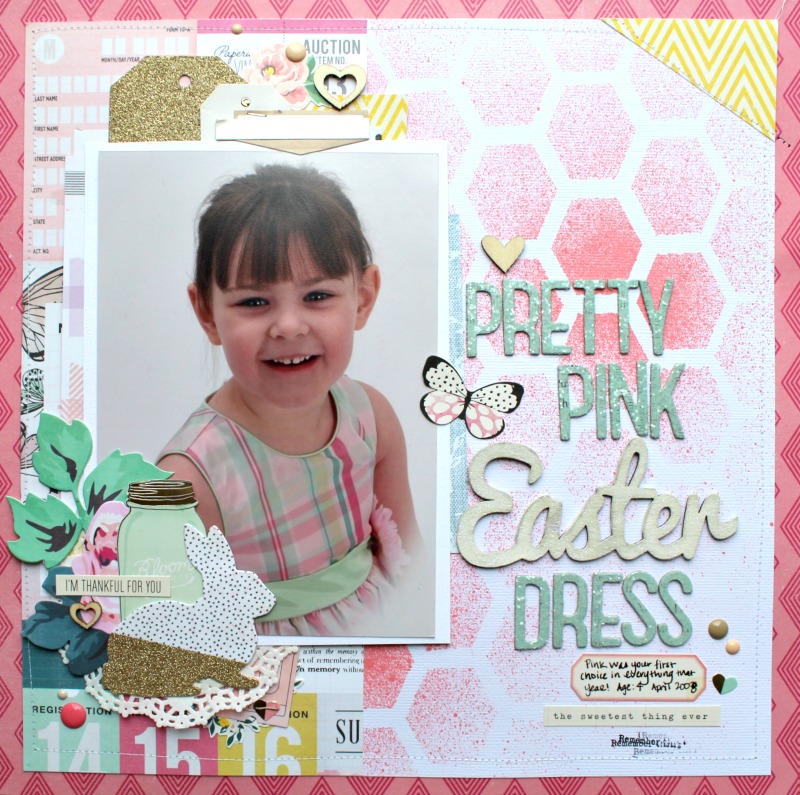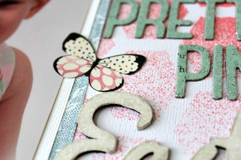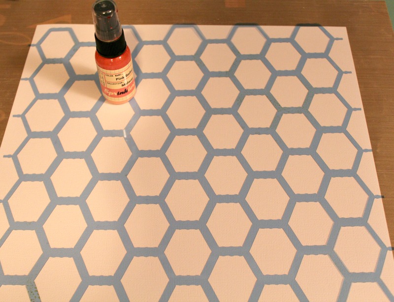 Before starting my layout, I used white cardstock as my background as well as my 12 Inch Chicken Wire Mascil with pink spray ink!