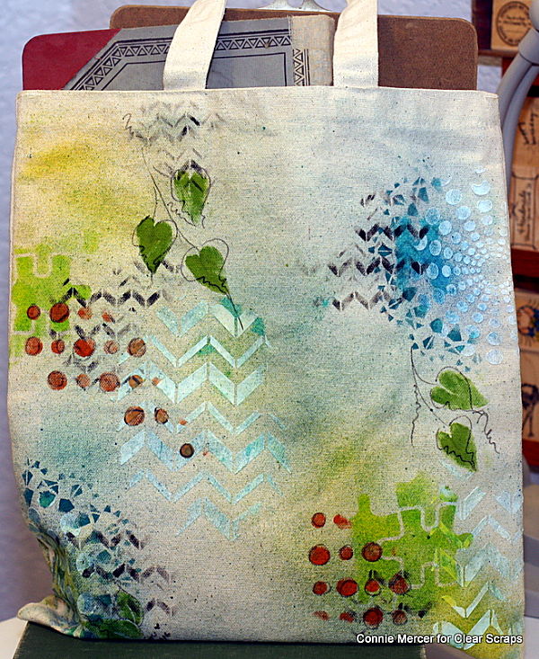 Hi, Connie here with a stenciled tote bag using nine different stencils by Clear Scraps. Nine that is almost ten stencils. Looks pretty cool, too and very fun to create.