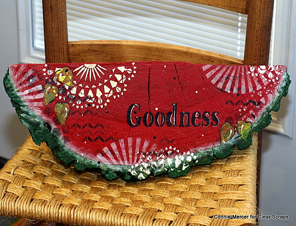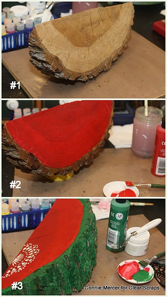 Hi, Connie here with a fun mixed media project using eight different stencils by Clear Scraps. All you need is a tree stump cut like a watermelon. That is not a hard request if you have a hubby with a chain saw and you live on a ranch. Let me show you~