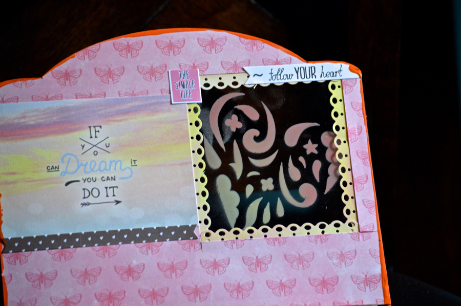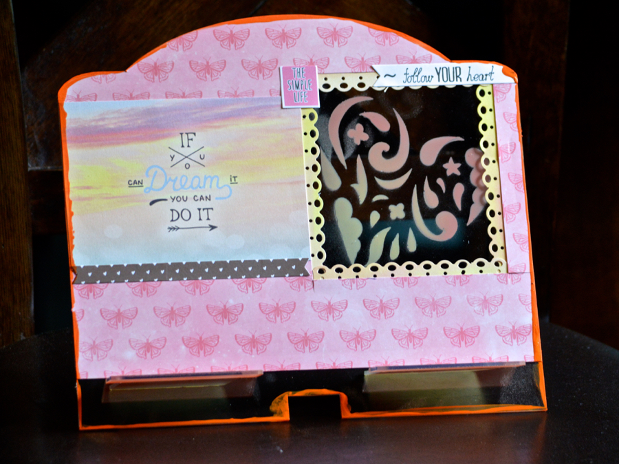 For this Tablet Stand I used the new 12" Heart Cluster Mascil to paint one of the hearts on the Tablet Stand and I used patterned paper to create a "window". Actually most of the papers were leftover from the Creating Made Easy May 2016 Kit!