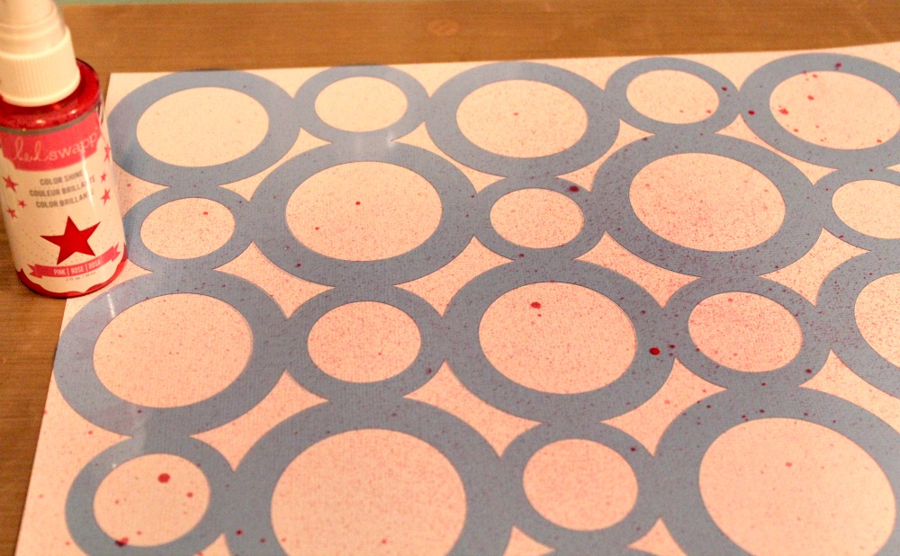 If you haven't played with the Clear Scraps Mascils yet, you must try them out! There is large variety of designs in both 6 and 12 inch as well as Border Mascils. Here, I used the 12 inch Circles Mascil with some spray in. This is a great way to add some depth to your project!