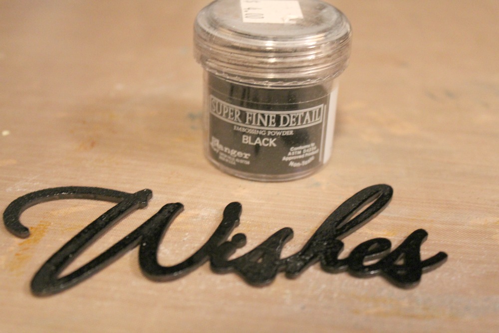 Next, I used a generous amount of black embossing powder to cover my chipboard.
