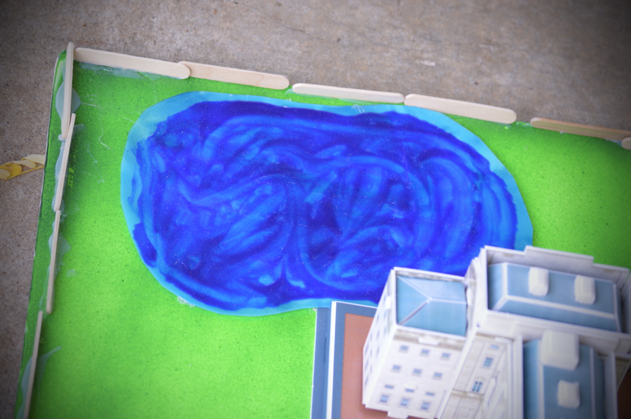 For the pond which he wanted to be 2D/3D I decided to use a Clear Scraps 12X12 Acrylic Sheet cut into a pond shape so it would look like actual water. Now the first time we applied it, I used a Glass Effects pen in light blue, know I would add a darker blue over.