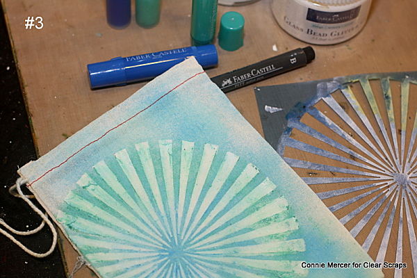 Hi, Connie here with some muslin bags to hold my Gelatos in, from Faber Castell. I created them using stencils from Clear Scraps and Faber Castell products. They were a ton of fun to make and I love that the Gelato sets are all together in a cute, mixed media type bag. Let me show you~