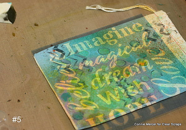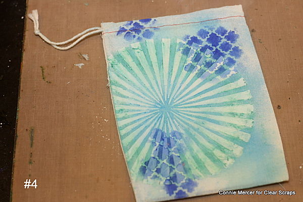This is the fun part! Using Clear Scraps 6" stencils start adding images to the front of the muslin bags. Let them overlap. Use Gelatos for color. I also used acrylic paint. You can also stencil with ink. Just mix it up. If you like add more color to the background.