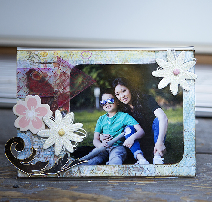 Hello everyone, this is Adora and today I am sharing with you this 5×7 desk page frame. I love that you get to embellish your own frame and put your own design base on the photo that you will use and your own style. This is a picture of my daughter and grandson. I cut the photo to show the design on the patterned paper , and of course I love that it is acrylic.