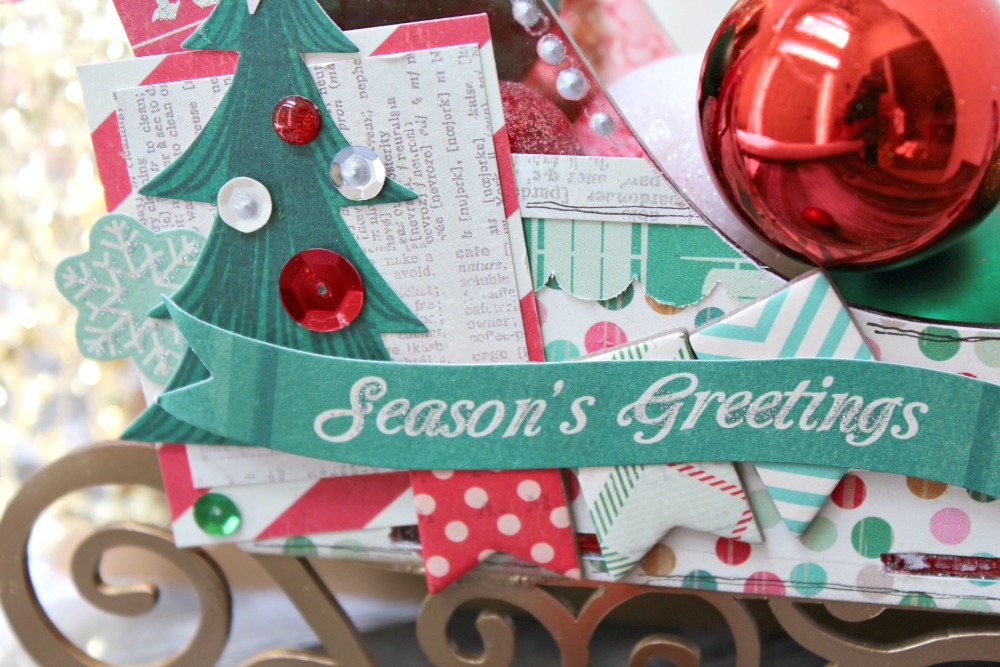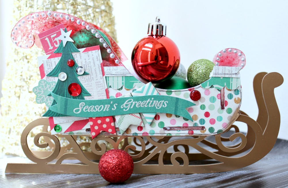 Afterwards, I added patterned papers and embellishments to decorate. I then filled my sled with mini Christmas ornaments and sat it on my table in the foyer!
