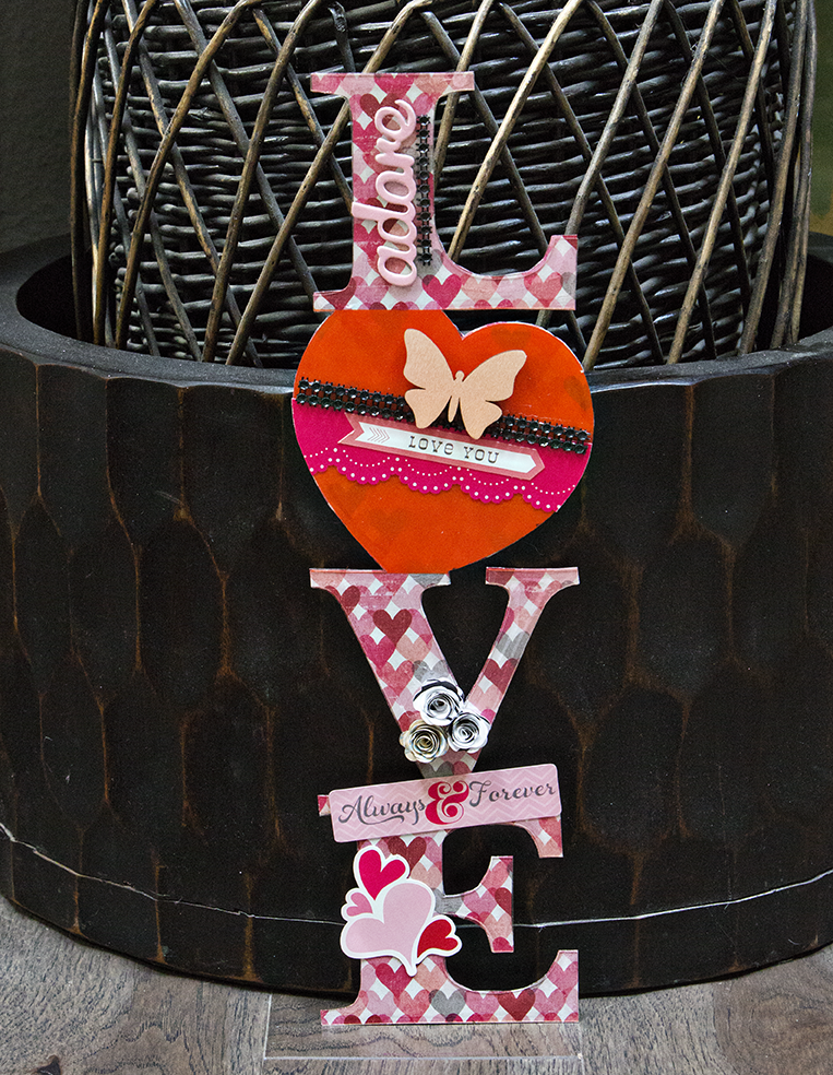 I trace and cut into a patterned paper. Adhere onto the back side of the acrylic, then add embellishments to finish the project.