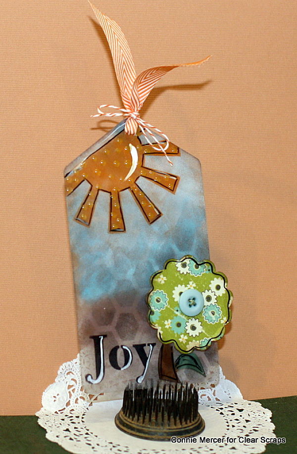 Hi, Connie here to share my August tag with you. I used an acrylic tag by Clear Scraps and Stazon ink to create tag full of "Joy".