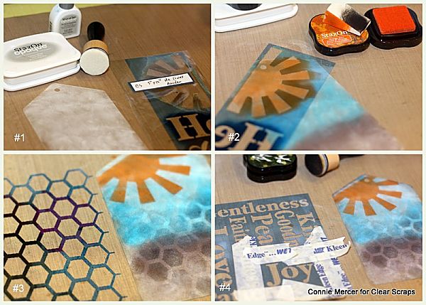 - Using black Stazon ink and the chicken wire stencil by Clear Scraps, sponge over the front of the tag. Let dry.