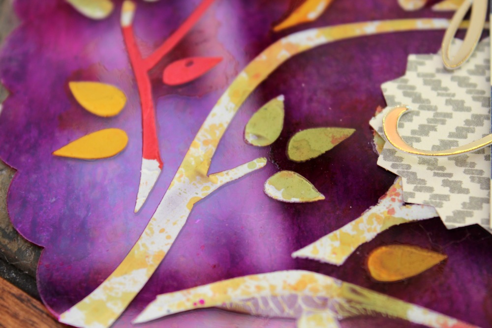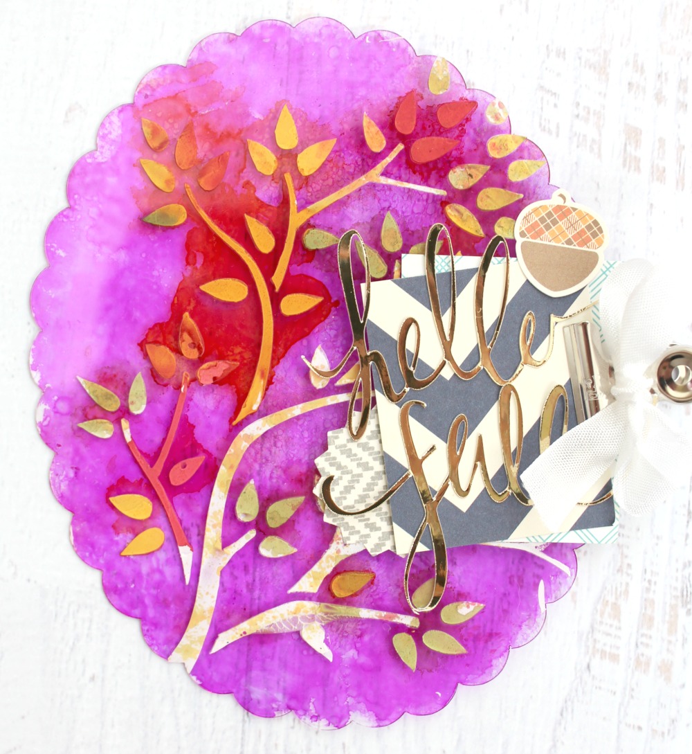 After removing the protective film from both sides of the clipboard, I used modeling paste and the 6 inch Tree Branch Mascil to create my image. I really love this Mascil BTW…perfect for fall themed projects!