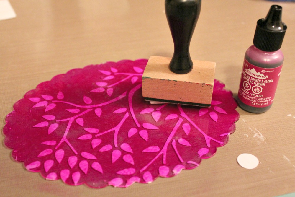 Once my modeling paste was dry, I flipped the clipboard over and applied Ranger Alcohol ink to the back to give a beautiful magenta color!