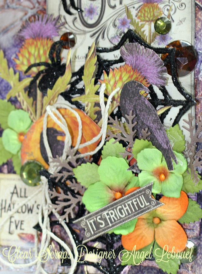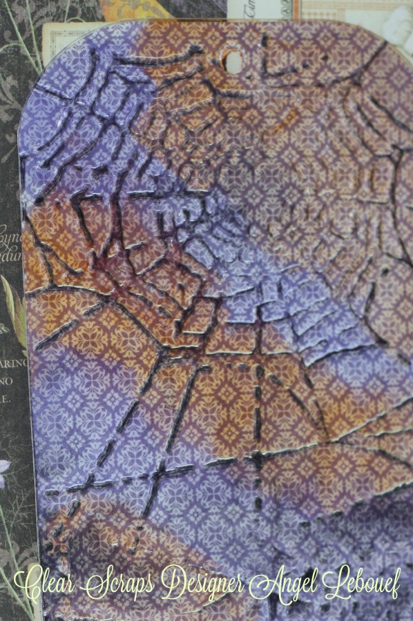 It was so much fun playing with this acrylic tag. I added pattern paper to the back and used a embossing folder to make the spider webs. I then used different color inks on top of the embossed surface.