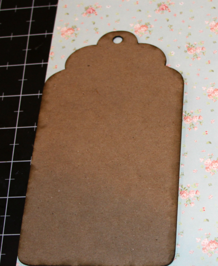 Using the center of the first piece of patterned paper, trace and cut a tag. This will be used in your mat for your photo. Set aside.