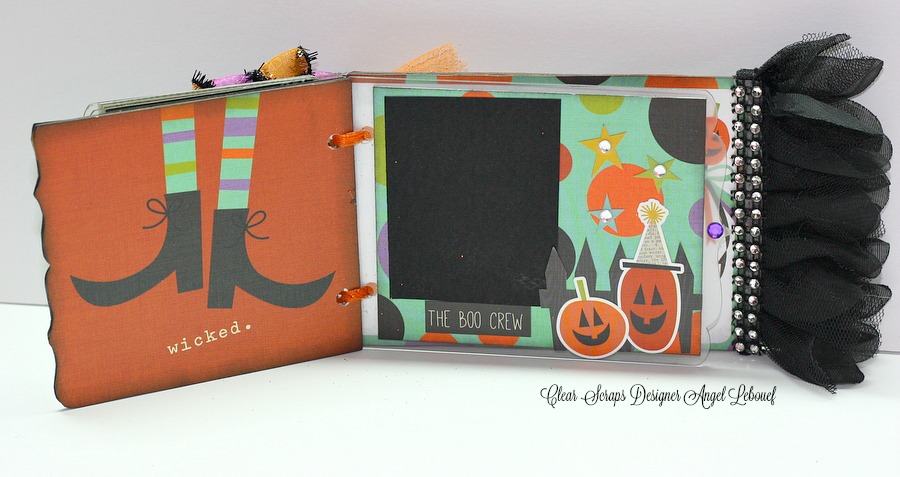 Other Supplies Used- Simple Stories Frankie and Friends Paper Collection, Ribbons and trims, Adhesive Rhinestone Trim, Orange Glitter Tulle, Black Card stock, Black soot Distressing Ink, Glue Gun and your favorite tape runner, Pencil and Scissors.