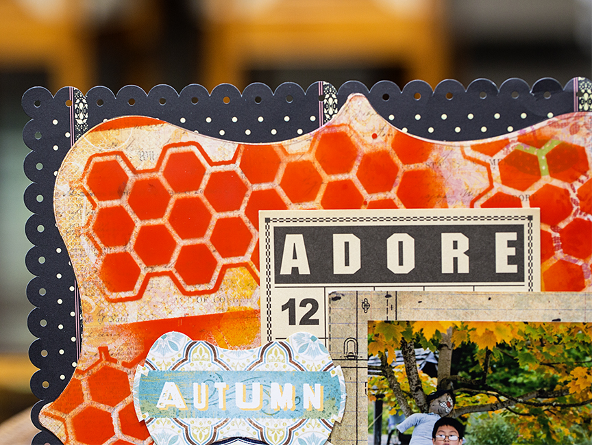 Here is a closer look. I use a spray paint and stencil directly onto the sheet, then use patterned paper to add dimension.