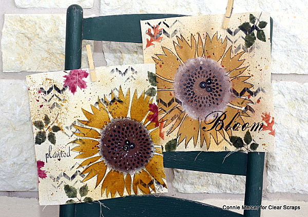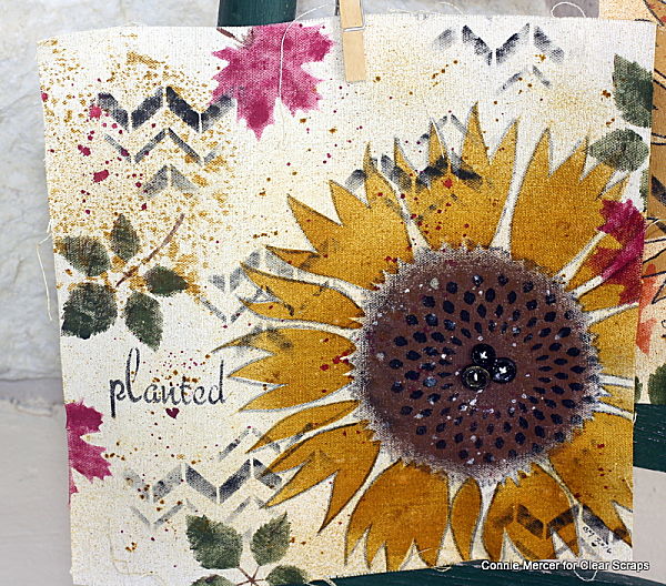 Hi, Connie here with two stenciled examples, on canvas squares, using the 12" Sunflower by Clear Scraps. I tried something new on my stenciling technique, a battery operated round stencil brush. I love how it applied the acrylic paint and I love how it handled the stencil. Let me show you~