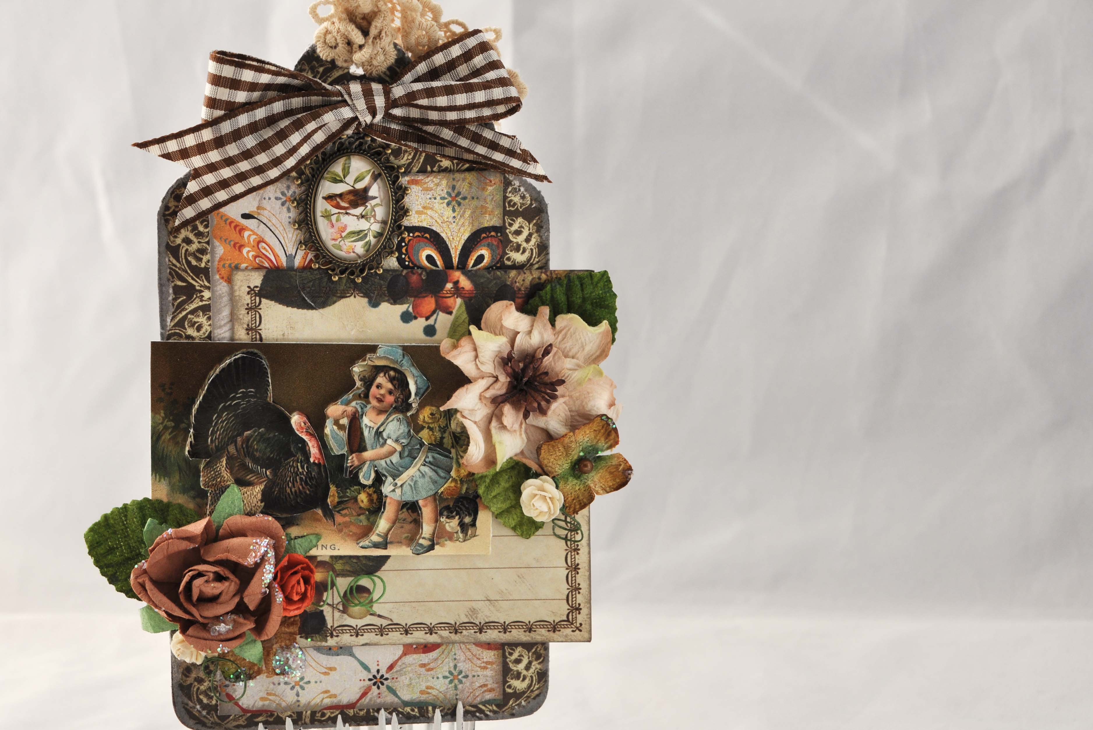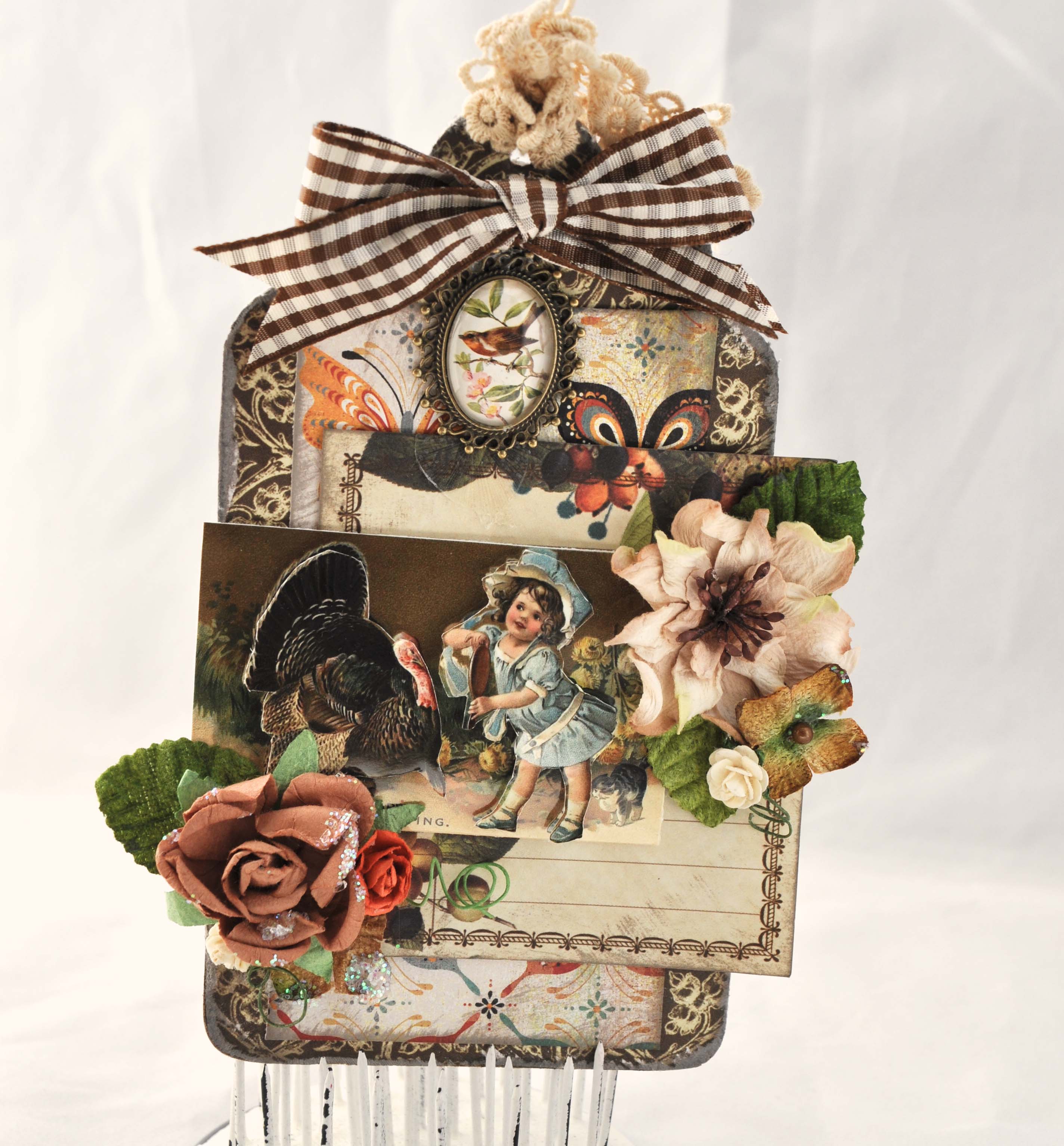 Featuring a lovely vintage image I found on the internet for free, and lots of flowers, and trims, this tag just speaks fall.