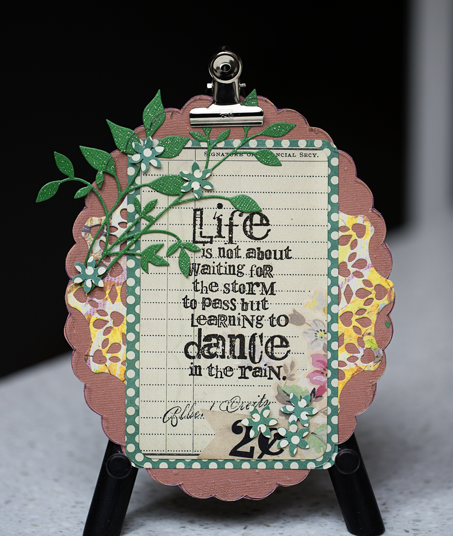 Note: I trace and cut the shape of the scallop onto a card stack; stamp a quote onto a label and layered different patterned and die cuts papers.