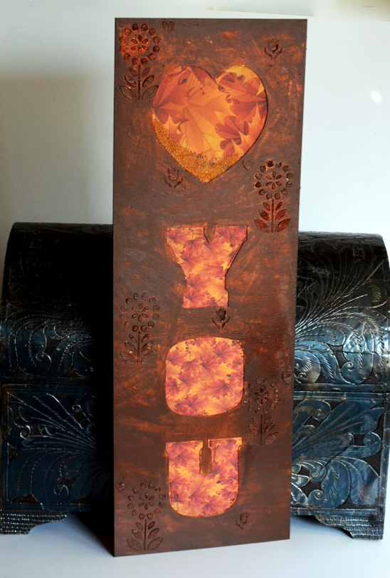 This project was created using the Love You Word Frame which is actually 20" long, so it makes a beautiful wall hanging. I actually painted the front gold, then dabbed on brown and orange paint after I used the 6" Folk Heart Mascil/Stencil with modeling paste.