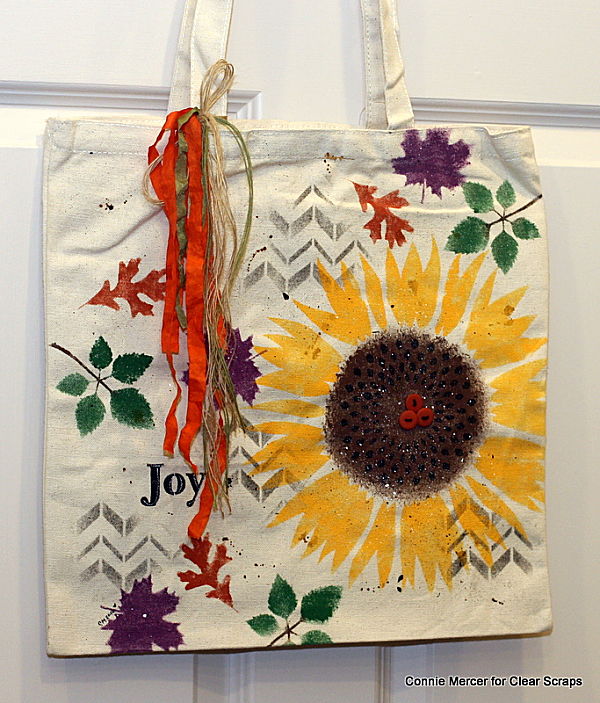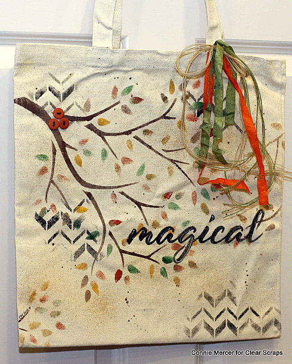 Hi, Connie here with a fun tutorial on creating a decorative tote bag using stencils by Clear Scraps. I have two tote bags to show using different stencils by Clear Scraps. Here is the first one with a tutorial on how it was created.