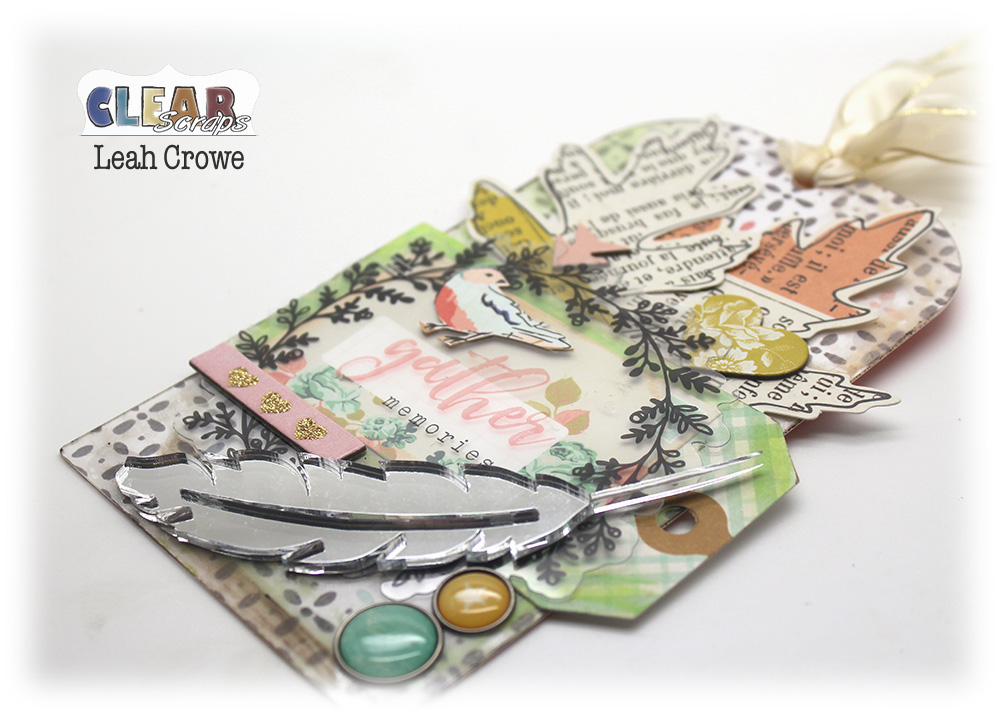 Products Used – Clear Scraps Acrylic Tag, Clear Scraps Feather Mirror Embellishments; Pattern Paper: American Craft Dear Lizzy, Crate Paper Maggie Holmes; Ephemera & Stickers: Crate Paper Maggie Holmes, American Craft Thickers, Simple Stories; Faber Castell Gelatos; Adhesive: Beacons 3-in-1; Ribbon: Misc
