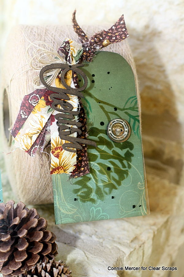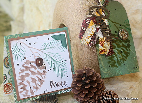 Hi, Connie here with my November tag and a Fall card, created with the 6" Pine Cone stencil, by Clear Scraps. I put pine cones in the same category as sea shells, I love creating with them and I love them just hanging around.