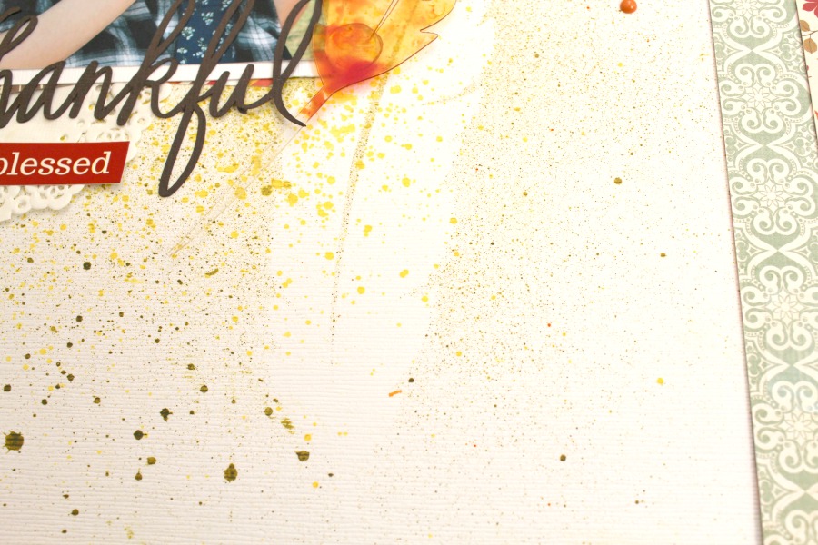 First, I began with a piece of white cardstock as my background and chose three coordinating colors of spray inks. I want to note that I used the Feather Mixer as a stencil WITH the protective film…just be sure to have some paper towels handy! This way you can wipe off the Mixer in between colors! Next, I placed the Mixer on my page in different positions and lightly misted with each ink. Again, you will want to wipe off your Mixer in between colors.