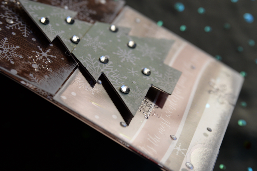 For the snowy effect on the edges I used StazOn Cotton White ink and added rhinestones to the tree.
